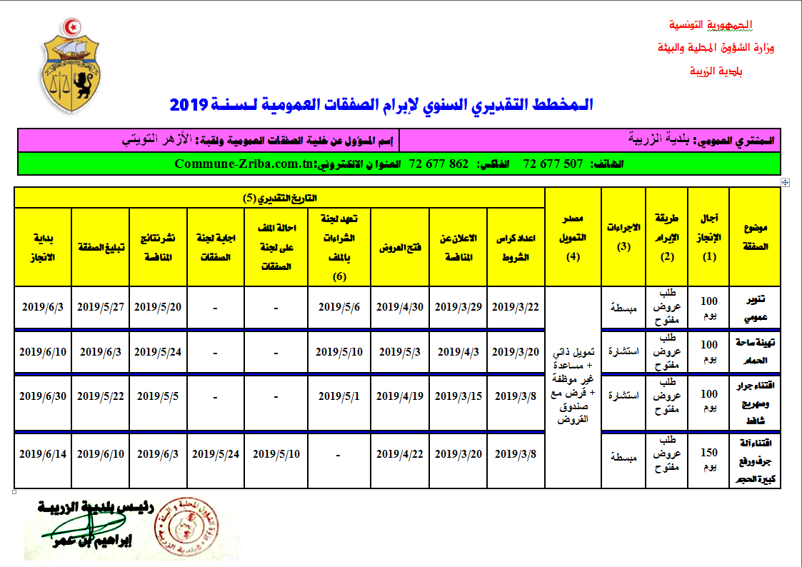 المخخط التقديري للصفقات العمومية ببلدية الزريبة لسنة 2019