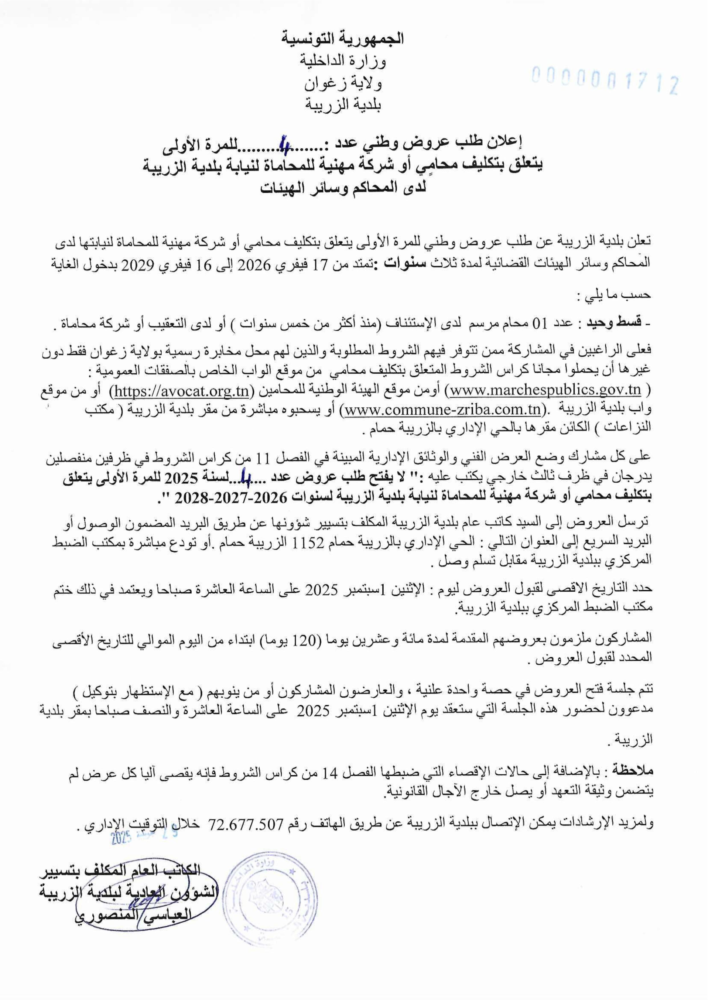 إعلان طلب عروض وطني بواسطة بلدية الزريبة, بتاريخ 06/08/2025 في بلدية الزريبة - لا يوجد تعليق كراس الشروط